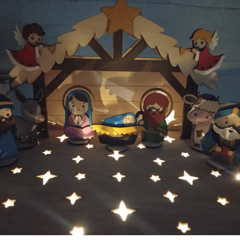 Con 13 personajes de 9 cm, un establo de madera y una caja-escenario de 30 × 40 cm, el pesebre se ilumina desde abajo gracias a sus luces incorporadas y a las estrellitas caladas de la caja, creando un ambiente cálido y encantador. Ideal para regalar, decorar y jugar durante toda la temporada.